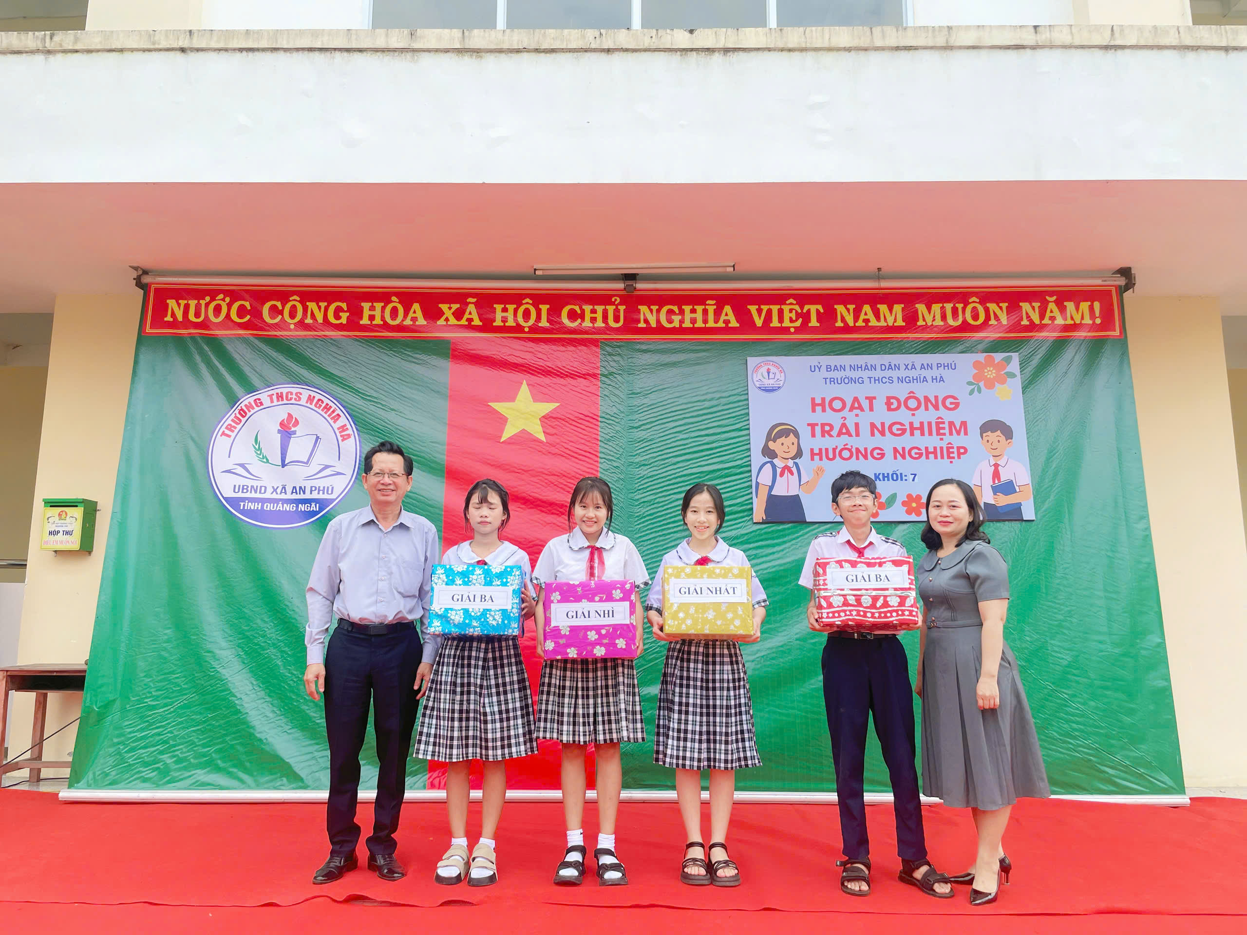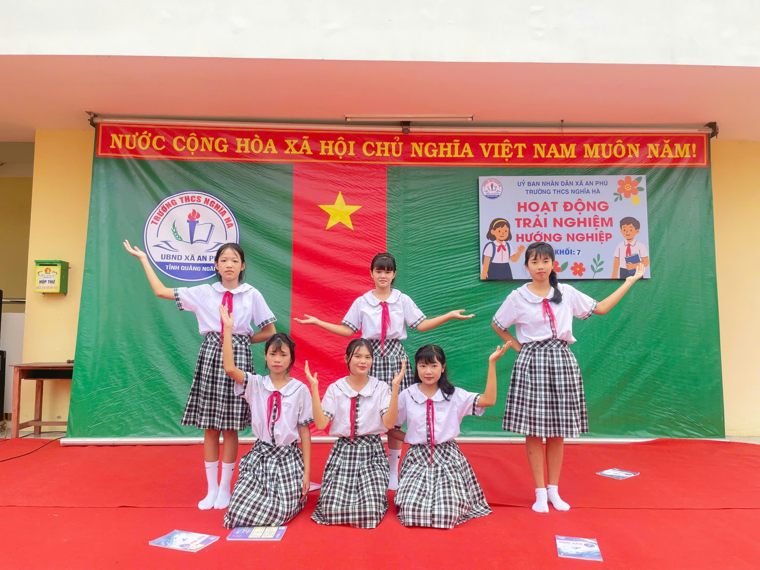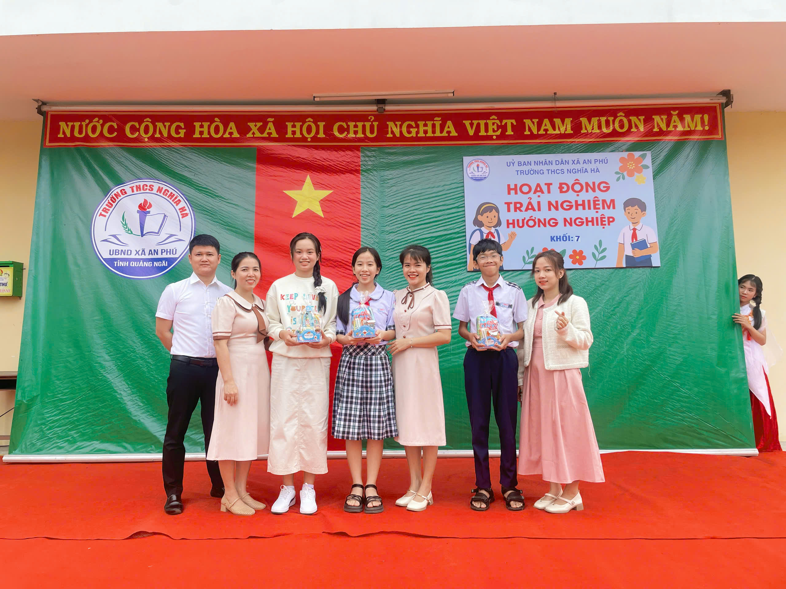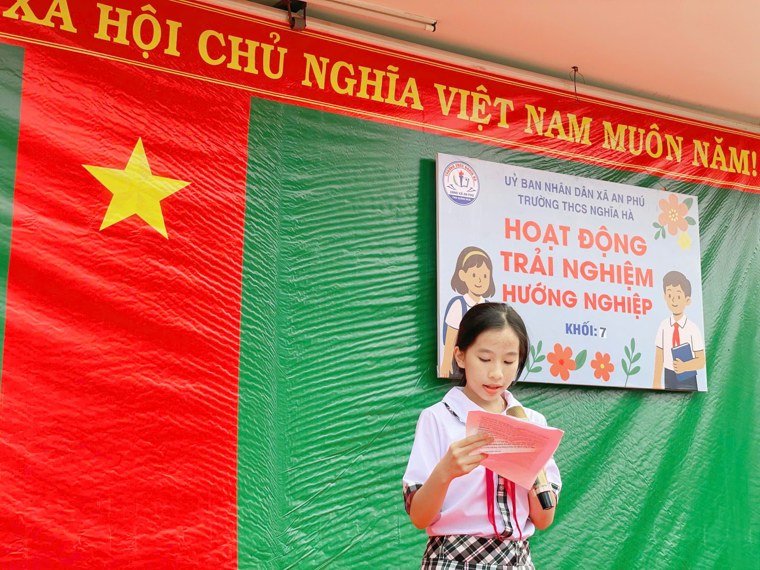 Sáng thứ Bảy, ngày 6/12/2025, tại sân trường THCS Nghĩa Hà, tiết Hoạt động trải nghiệm – Sinh hoạt dưới cờ khối 7 đã được tổ chức trong không khí trang trọng nhưng không kém phần sôi nổi. Đến với tiết hoạt động trải nghiệm của khối 7 vinh dự đón tiếp thầy Trần Công Hùng – Bí thư Chi bộ, Hiệu trưởng nhà trường; Cô Nguyễn Thị Thanh Nga – Phó bí thư Chi bộ, Phó Hiệu trưởng nhà trường, cùng 4 giáo viên chủ nhiệm và hơn 170 em học sinh khối 7. Chương trình được xây dựng công phu, sáng tạo, kết hợp hài hòa giữa vui chơi, trải nghiệm và giáo dục giá trị sống, để lại nhiều ấn tượng sâu sắc trong lòng thầy cô và các em học sinh.